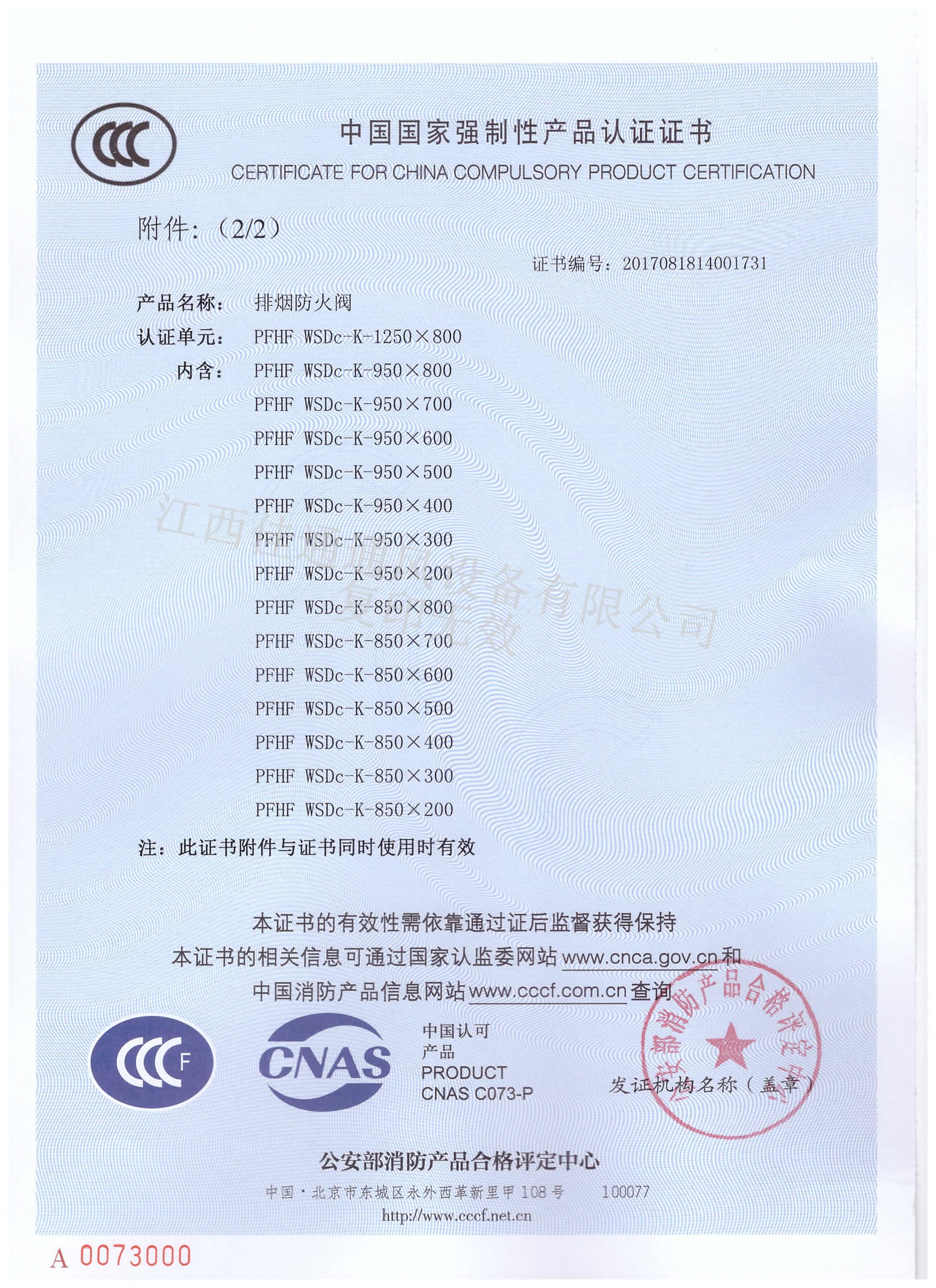 消防3C認(rèn)證證書排煙防火閥1250×800(分型2)