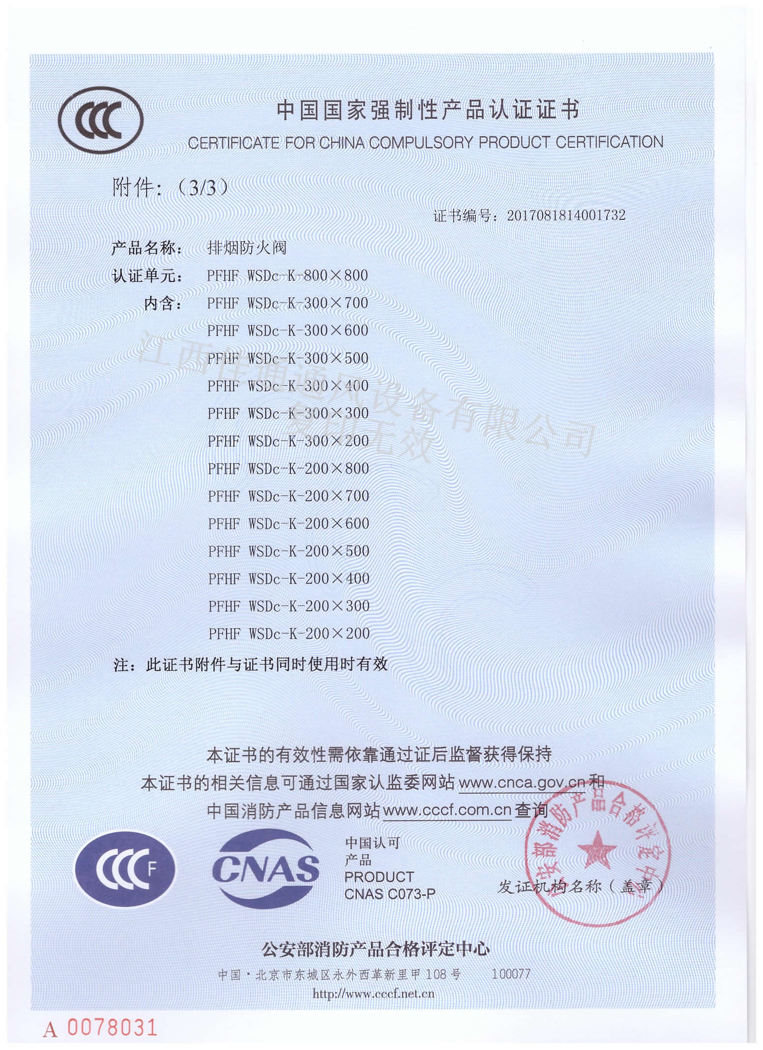 消防3C認(rèn)證證書排煙防火閥800×800(分型3)