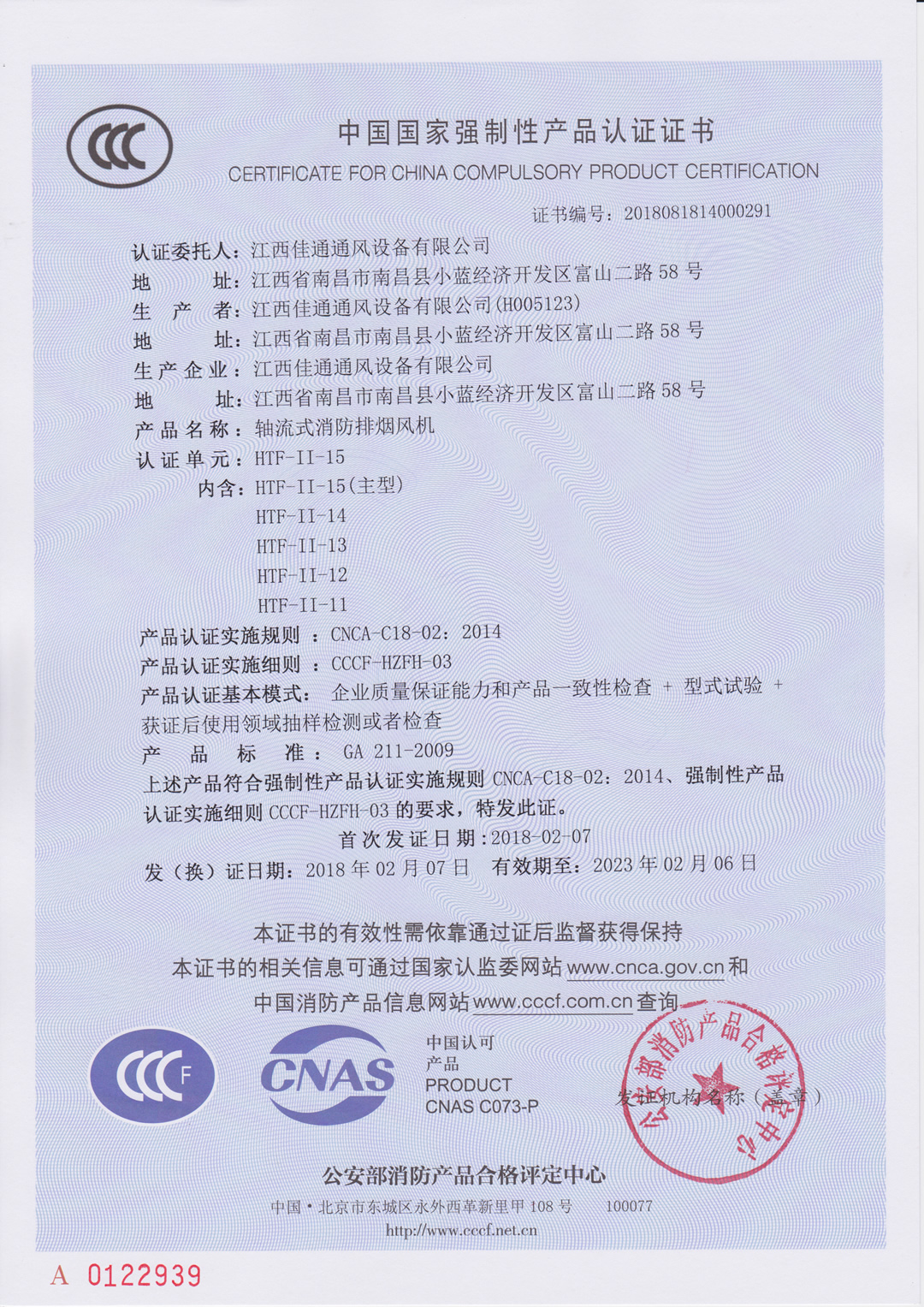 軸流式消防排煙風機(雙速)HTF-II-15(主型)消防3C認證證書