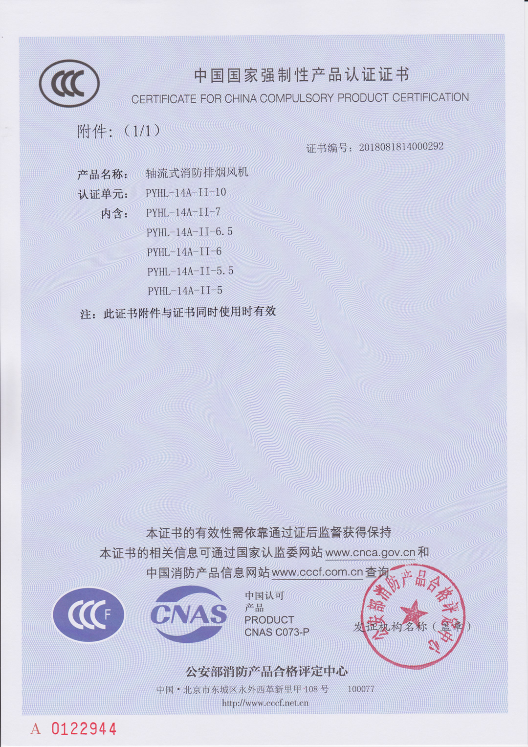 軸流式消防排煙風(fēng)機(jī)(雙速)PYHL-14A-II-10(分型)消防3C認(rèn)證證書