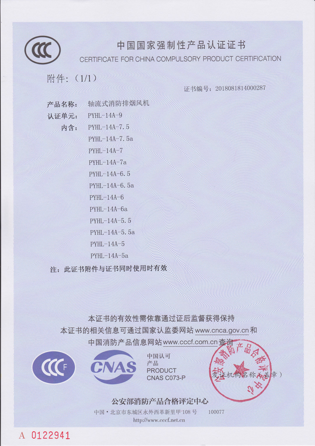 軸流式消防排煙風(fēng)機(jī)PYHL-14A-9(分型)消防3C認(rèn)證證書(shū)