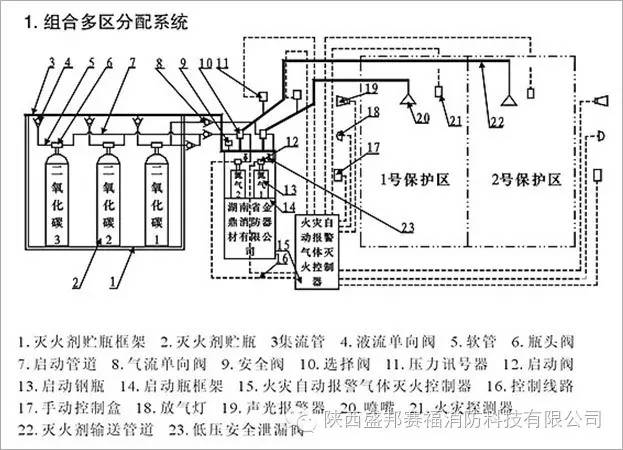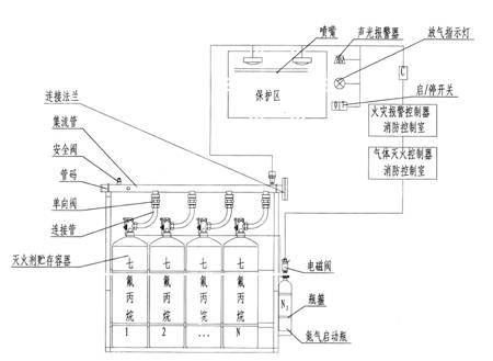 七氟丙烷滅火系統(tǒng)主要部件有:儲存滅火劑容器、儲存啟動氣體容器、容器閥、單向閥、連接管、安全泄壓閥、選擇閥、信號反饋裝置、集流管、電磁閥、壓力顯示器、管路、噴嘴。