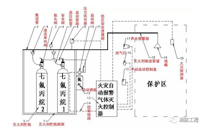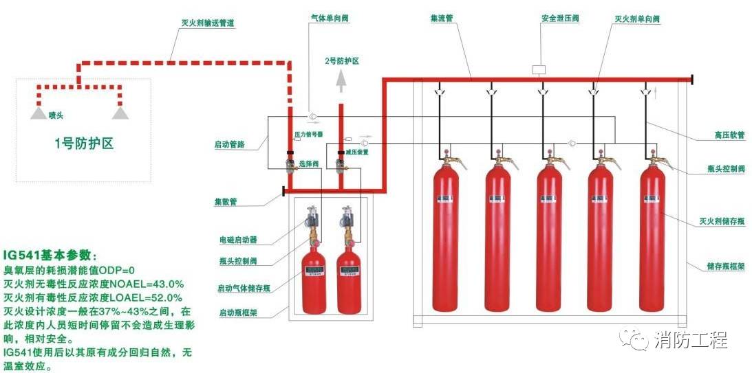 氣體滅火系統(tǒng)一般由滅火劑瓶組、驅(qū)動氣瓶組、單向閥、選擇閥、減壓裝置、驅(qū)動裝置、集流管、連接管、噴嘴、信號反饋裝置、安全泄壓裝置、控制盤、檢漏裝置、低泄高封閥、管路管件等部件構(gòu)成。不同的氣體滅火系統(tǒng)其結(jié)構(gòu)形式和組成部件的數(shù)量不完全相同。